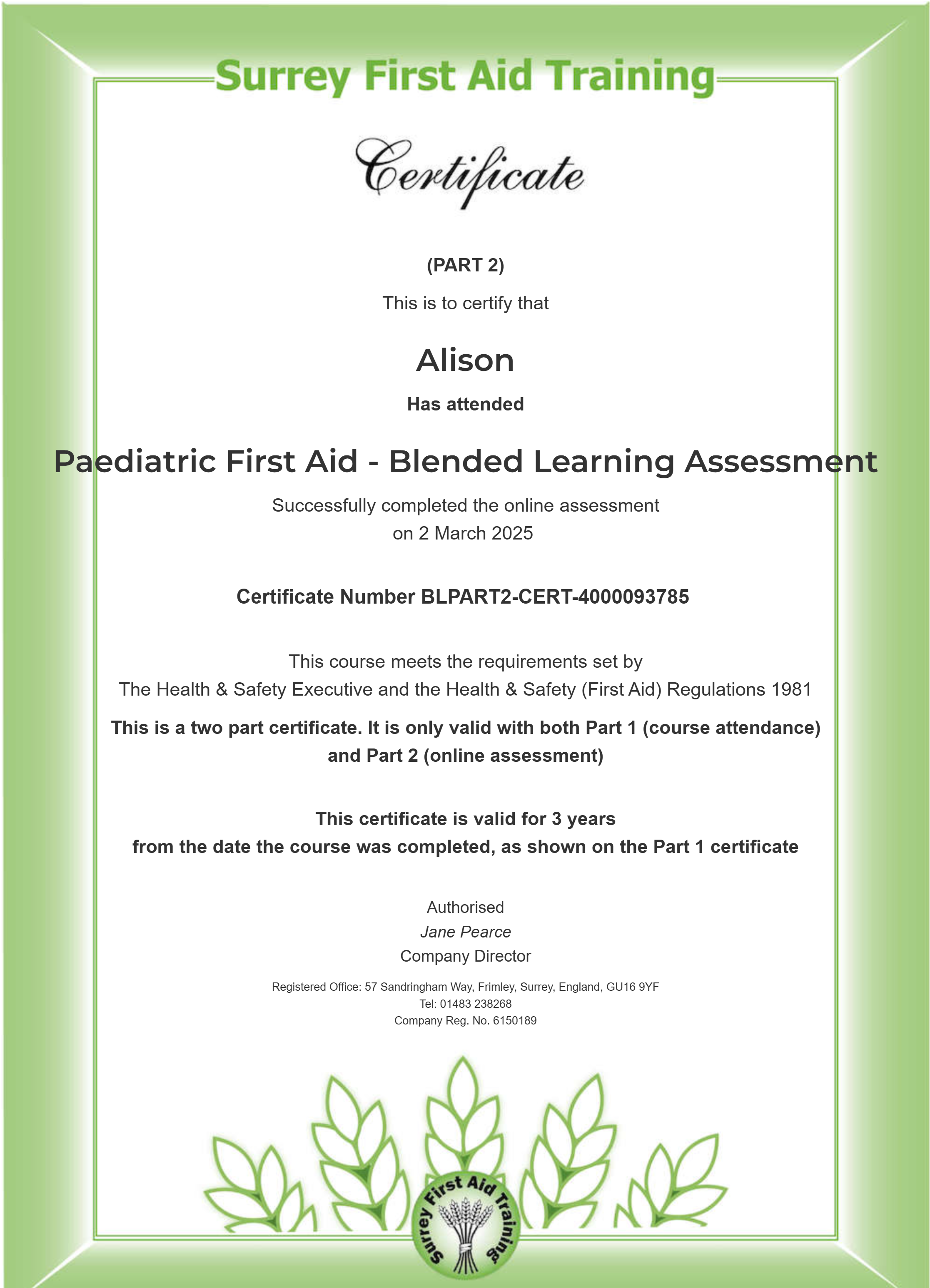 This is a two part certificate. It is only valid with both Part 1 (course attendance)